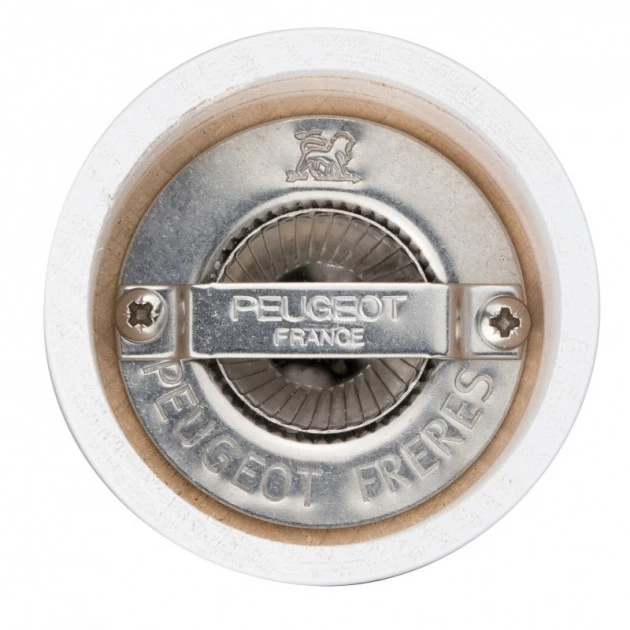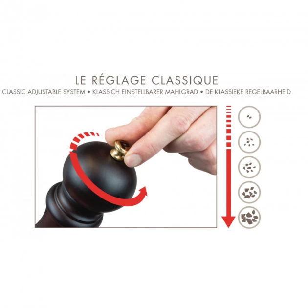 Le moulin à poivre et le moulin à sel Peugeot sont coiffés d’un bouton en acier brossé qui permet de régler la mouture. Plus le bouton est serré, plus la mouture est fine, et inversement.