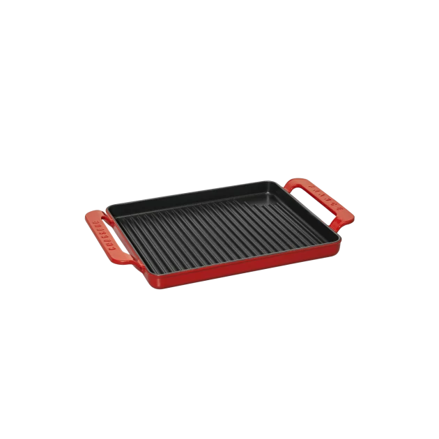 L’émaillage rubis (rouge) est fait à la main pour apporter une touche de couleur, et le gril est pourvu d’une double poignée pour une meilleure maniabilité.