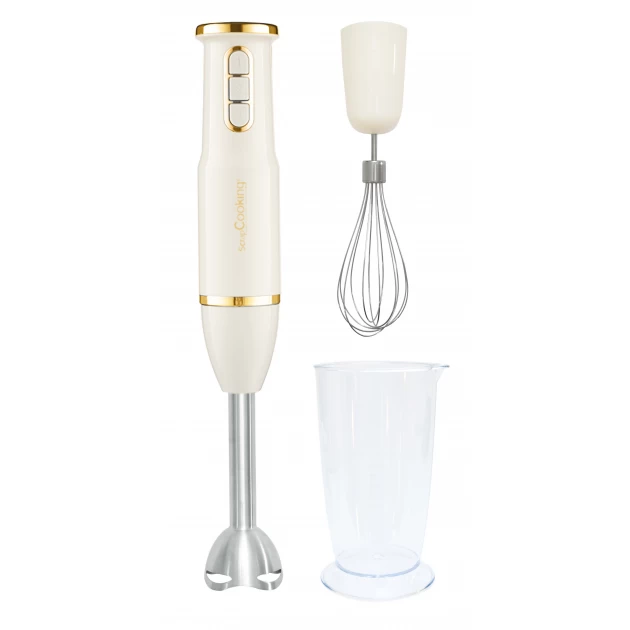 Simple d’utilisation, ce mixeur plongeant répondra à toutes vos attentes. D’une dimension de 42 cm de long pour 5,5 cm de diamètre, le mixeur Scrapcooking est livré avec plusieurs accessoires. Vous retrouverez ainsi un verre doseur en plastique de 700 ml, un broyeur ainsi qu’un fouet inox. La particularité de ce mixeur plongeur est qu’il dispose également d’un hachoir de 500 ml avec des lames en inox.