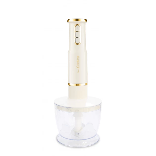 Proposé dans un design à la fois sobre et élégant, ce hachoir mixeur se pare d’une couleur crème finition mate avec un liseré doré pour la touche “wouah”.