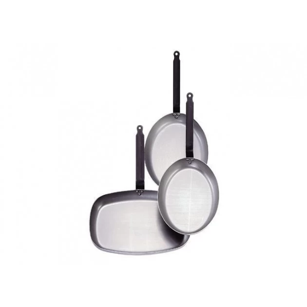 Les poêles ovales ont la forme idéale pour cuisiner les poissons entiers. A noter, ce modèle de poêle a une queue rivetée sur le grand axe.