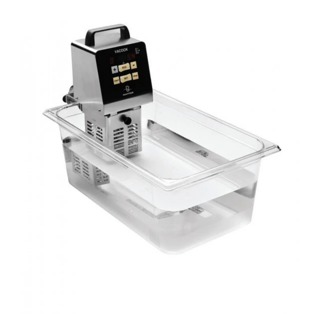 Le Thermo Plongeur VACOOK se compose d’une résistance et d’une turbine. L’eau va ainsi rapidement monter en température (jusqu’à 100°C) et va être brassée afin d’être à la même température sur l’ensemble du volume. L’appareil de cuisson sous vide professionnel VACOOK s’arrête automatiquement en cas de manque d’eau. Il peut s’adapter sur les bacs gastronorme jusqu’à 50 litres.